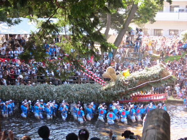 4年に一度、全長36mの龍蛇を担ぎ雷電池へ入水する伝統行事。